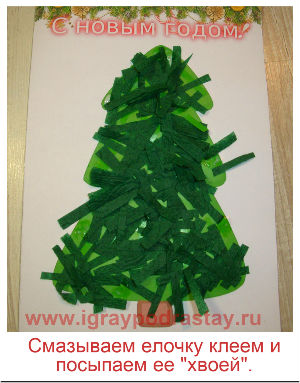 Смазываем елочку клеем и посыпаем ее бумажными полосочками (это будет "насыпная" аппликация - и малыши, и дети постарше очень любят ее за свою простоту):