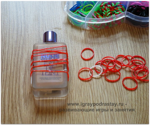 Баночку и резиночки подбирайте так, чтобы баночка была шире резиночки, тогда ребенку придется резиночку растягивать и натягивать, а это развивает не только пальчики, но и сноровку, умение преодолевать трудности.