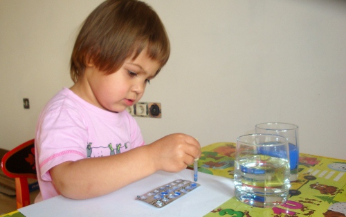 - вода (будет здорово, если вы добавите в нее чуть-чуть гуаши или красок – яркие цвета особенно привлекают детей. Но обычная вода тоже подойдет. Раскрашивать воду мы начали не сразу, первые несколько раз экспериментировали с простой водой);