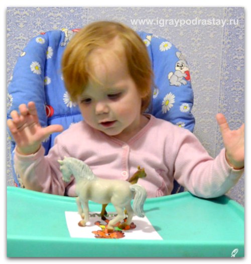 Рассматриваем животное, обращаем внимание на части тела, пополняем словарный запас ребенка словами « длинный и пушистый хвост», «грива, «уздечка» и т.д. Не забываем про звукоподражание.