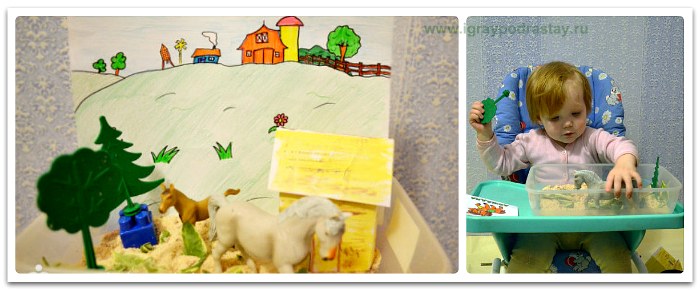 Переходим к сенсорной коробке. Тут можно покормить лошадок травкой, спрятать лошадей в стойло на ночь, посмотреть какие следы оставляют лошадки на песке (манке). И просто поиграть.