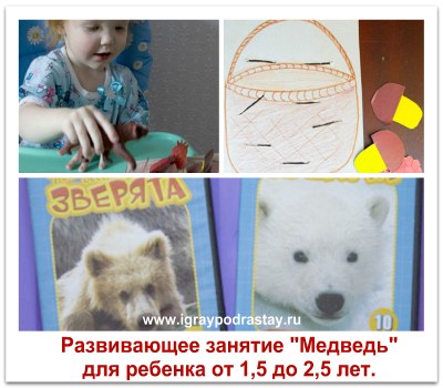Продолжаем ежедневные занятия, и темой третьего дня будет медведь. Занятие, как и в прошлые дни, начинается с презентации и рассматривания фигурки и карточки. Расскажите малышу о медведях, о том, как и где они живут, о зимней спячке. Посмотрите, какие маленькие ушки, глазки и хвост, а тело достаточно большое. Не забудьте и про звукоподражание.